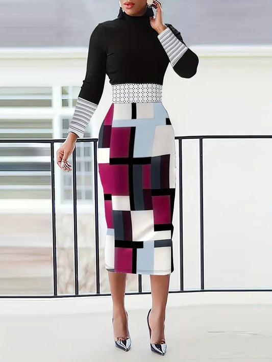 Abito in jersey con stampa geometrica da donna – Elegante collo alto e maniche lunghe