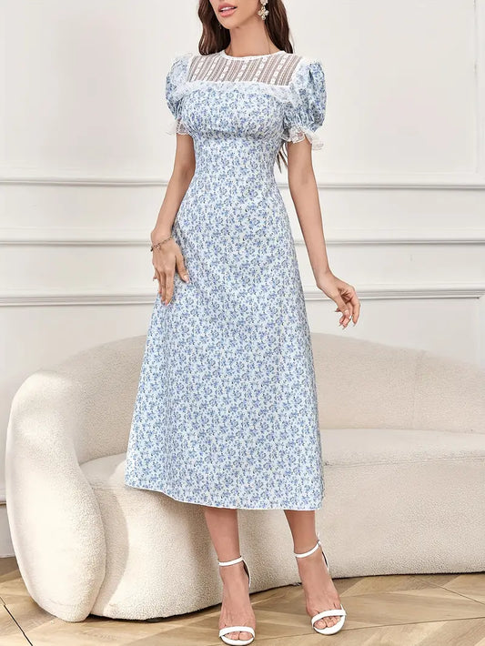 Abito in chiffon con scollo tondo e maniche a lanterna