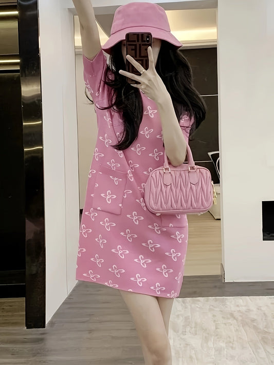 Abito in maglia con motivo floreale - vestibilità bodycon, maniche a sbuffo, scollatura rotonda