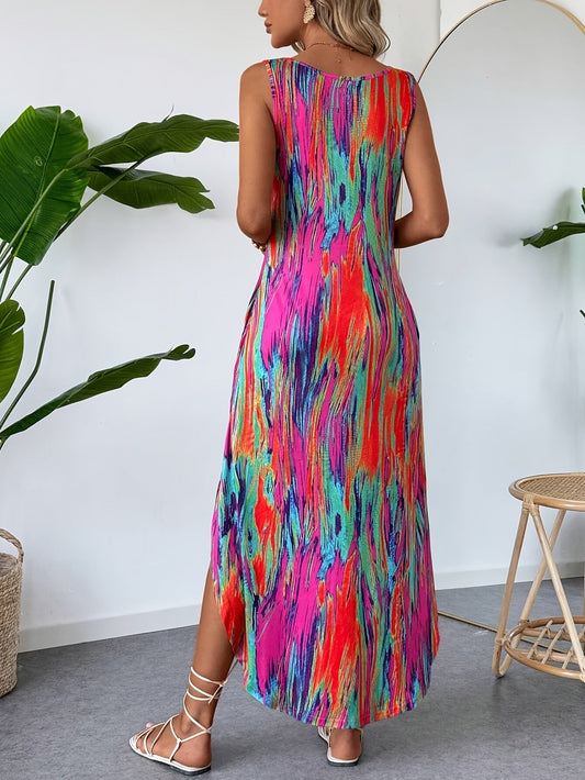 Abito estivo da donna stampato patchwork con scollo rotondo e senza maniche