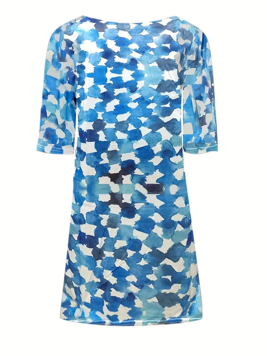 Abito blu con stampa all-over, scollatura a V e maniche a mezza lunghezza