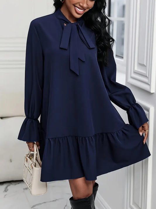 Sofisticato abito a maniche lunghe con scollatura a fiocco e balze