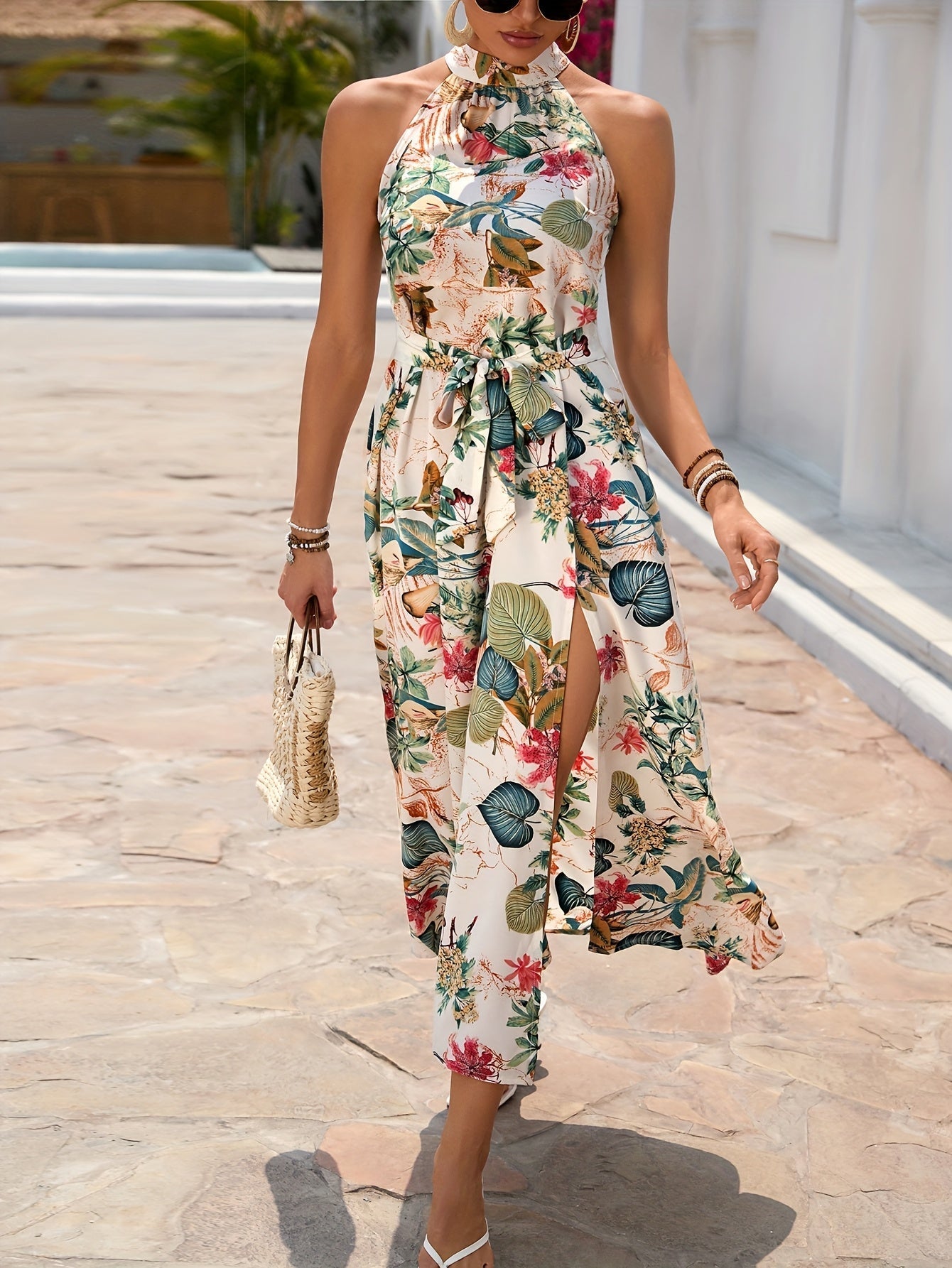 Abito con motivo floreale e cintura, vestito estivo per le vacanze