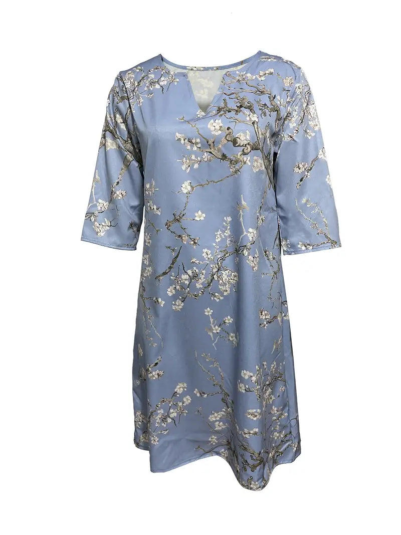 Abito con scollo a V e stampa vegetale, maniche a 3/4 Taglio ampio