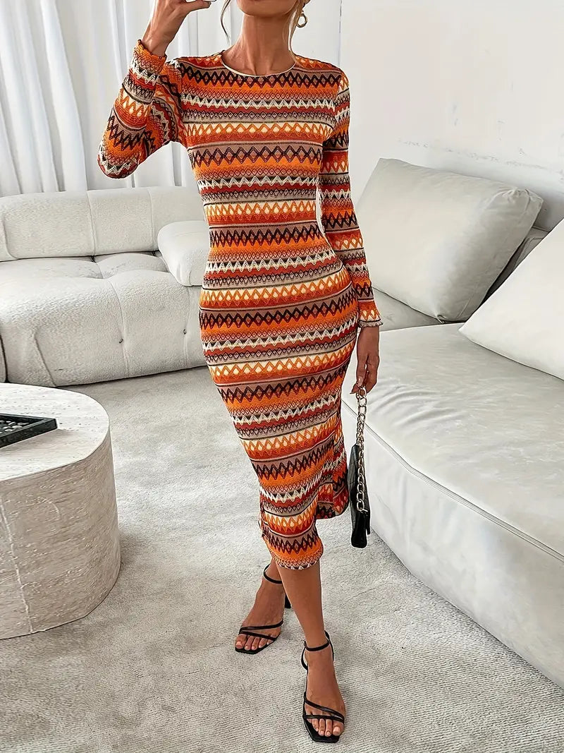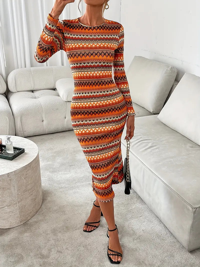 Questo elegante abito da donna in maglia con motivo geometrico è un vero e proprio eye-catcher per la stagione autunnale e invernale.