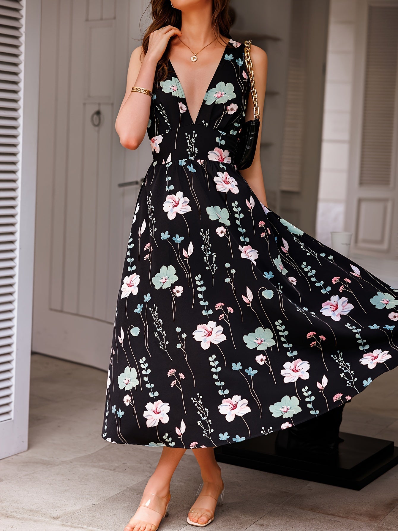 Aggiungete un tocco di eleganza al vostro look estivo con questo abito estivo con stampa floreale. La linea ad A senza maniche e la scollatura a V creano una silhouette femminile perfetta per le giornate calde.