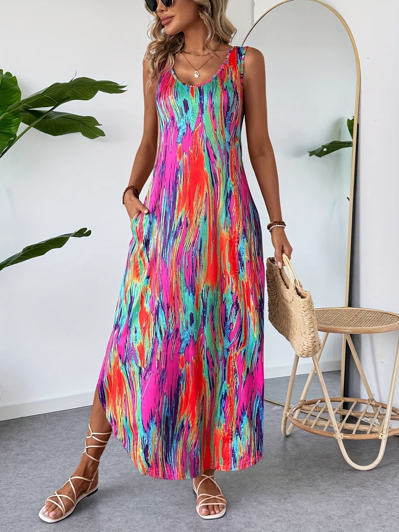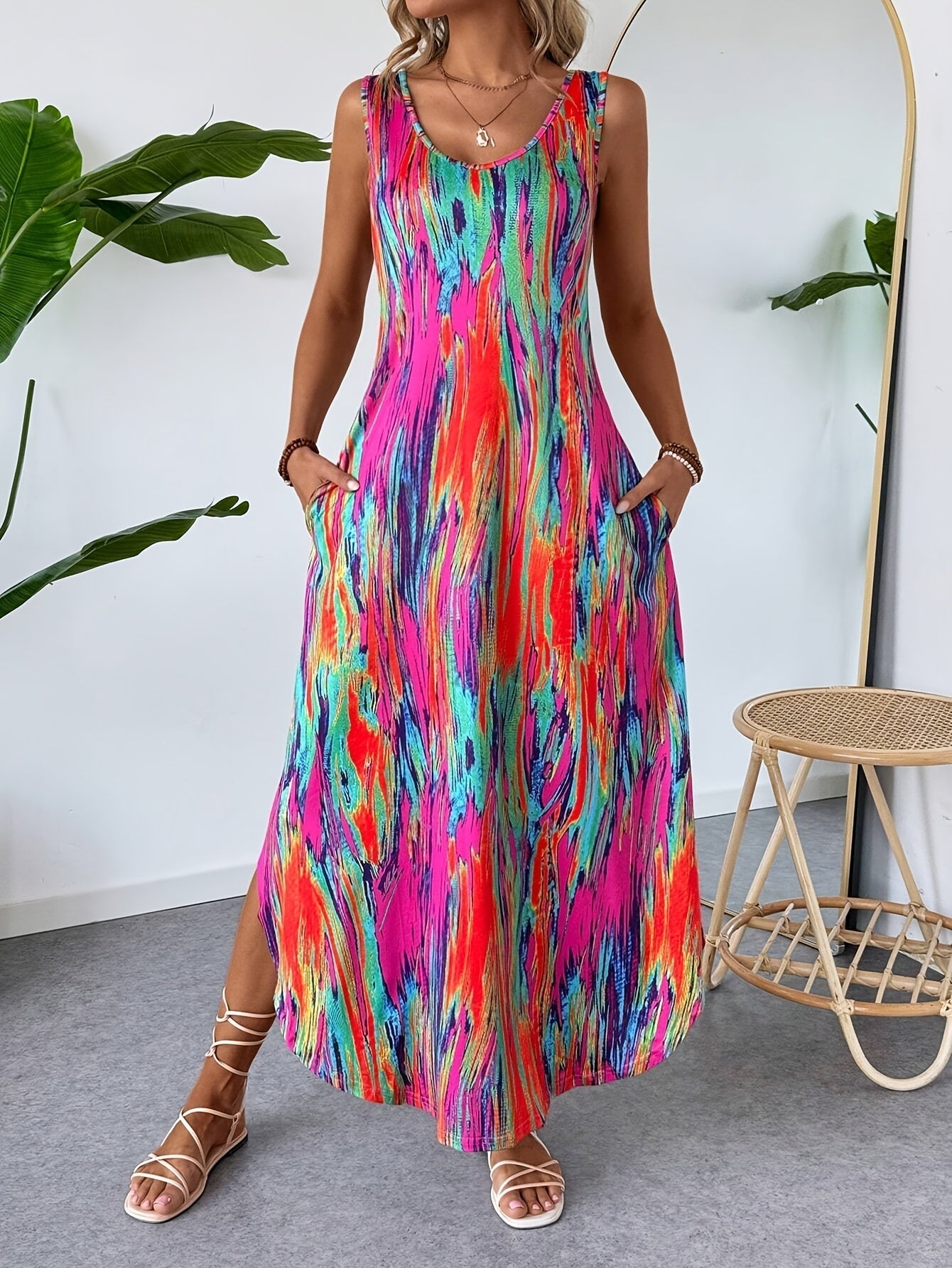 Abito estivo da donna stampato patchwork con scollo rotondo e senza maniche