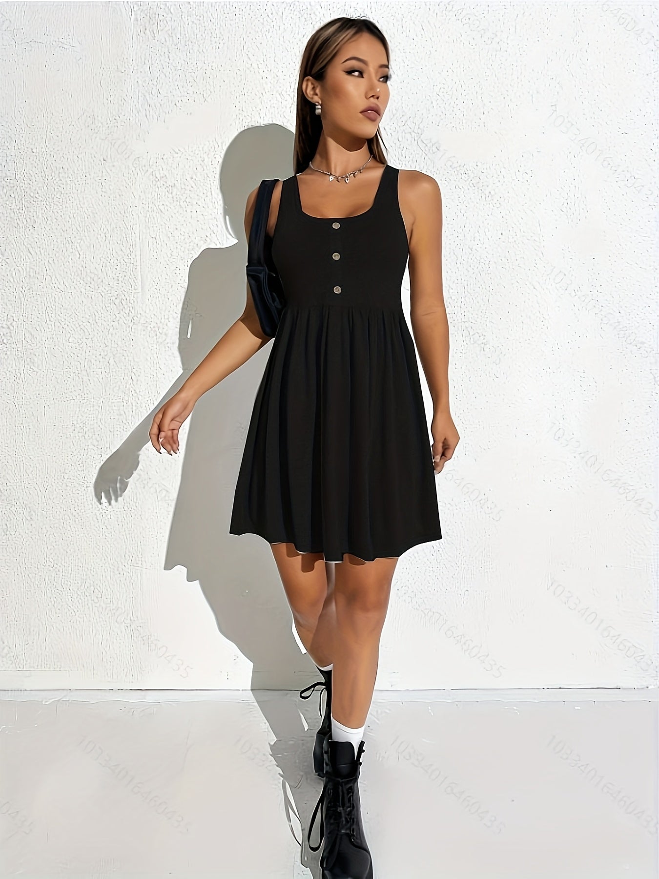 Questo elegante abito senza maniche nei toni del grigio e del nero è un must-have per l'estate. Realizzato in poliestere leggero e traspirante, si adatta perfettamente alla silhouette per un comfort che dura tutto il giorno. Il taglio classico con scollo a V e bottoni decorativi sottolinea lo stile femminile.