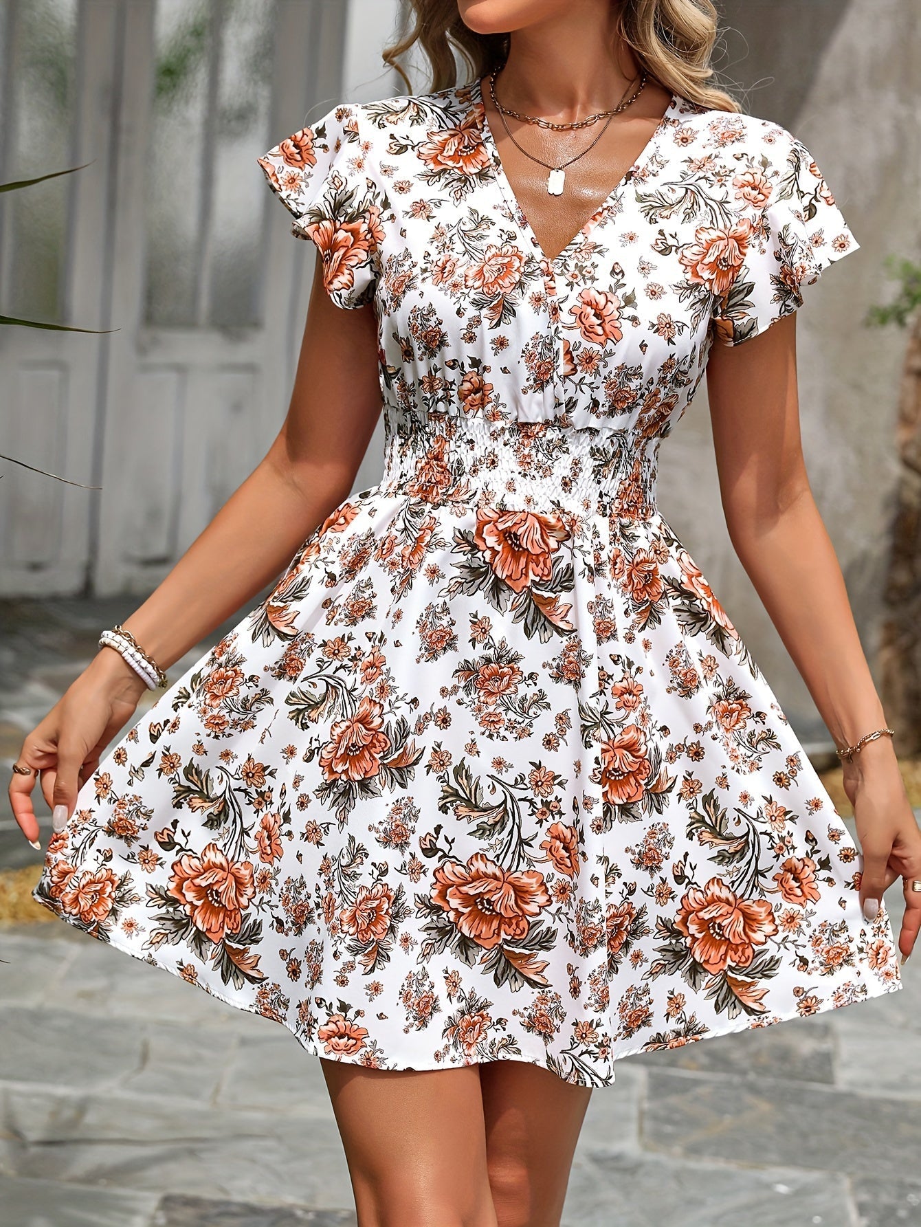 Abito floreale - Abito elegante con maniche arricciate, scollatura a V e vita smocked per l'estate