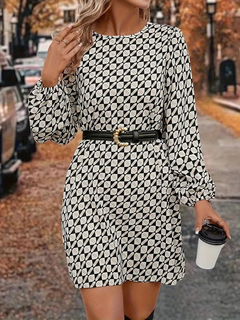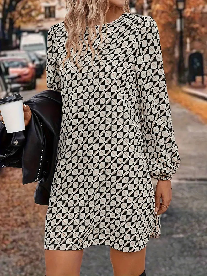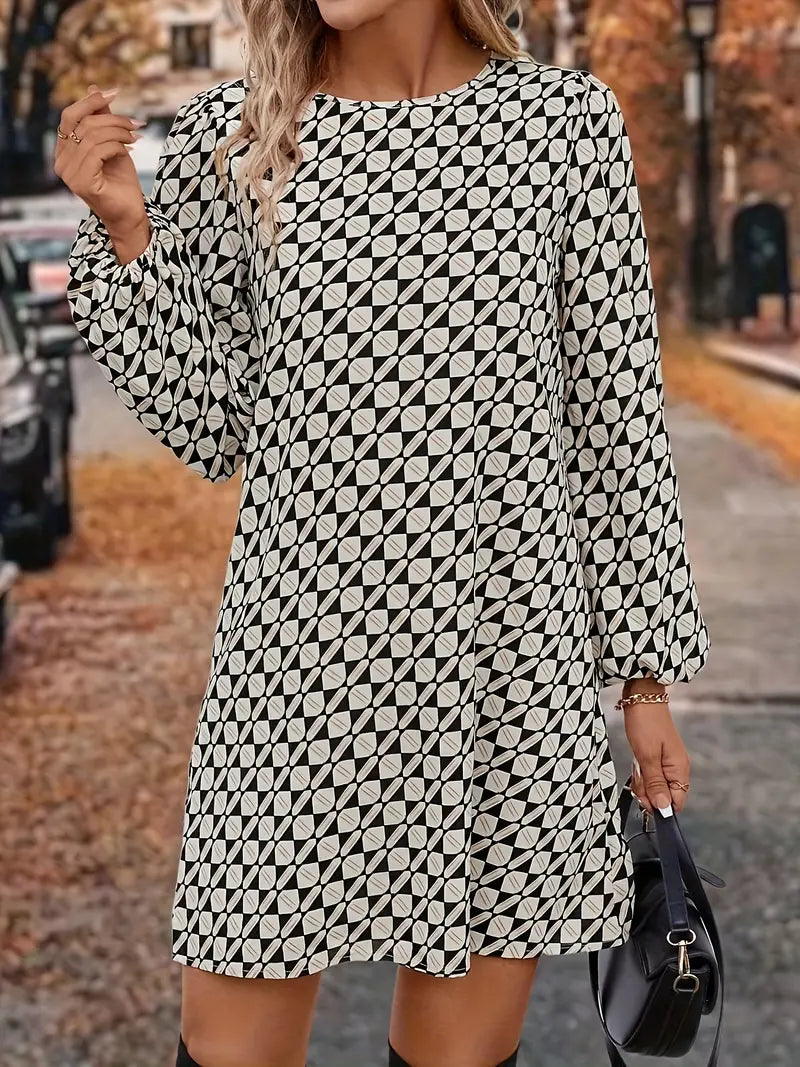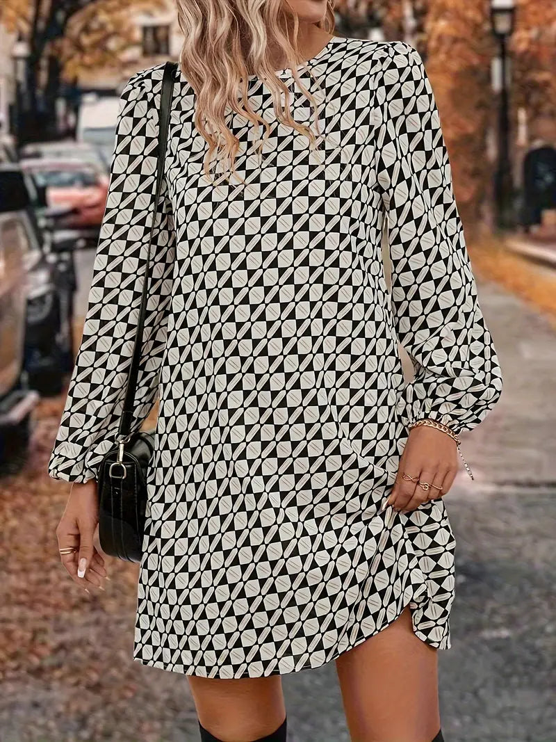 Questo elegante abito con stampa geometrica e maniche a lanterna unisce stile e comfort per ogni occasione. Con un classico scollo rotondo e maniche a lanterna di tendenza, offre un look chic e moderno. Realizzato in poliestere non elasticizzato, l'abito è traspirante, resistente e lavabile in lavatrice per una facile manutenzione. La stampa geometrica aggiunge un tocco di raffinatezza e versatilità al vostro guardaroba. Perfetto per il lavoro, le feste o gli incontri casual, aggiunge eleganza senza sforzo. Abbinatelo alle vostre scarpe preferite o alle ballerine per una finitura elegante.