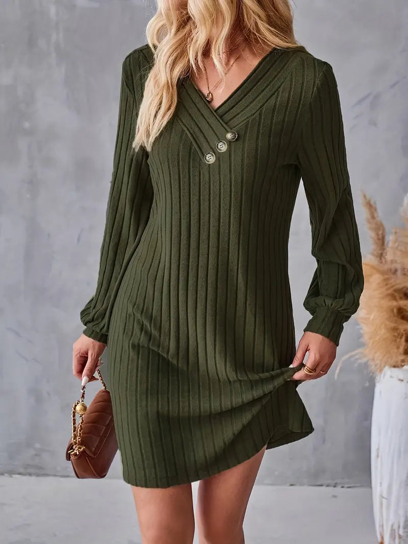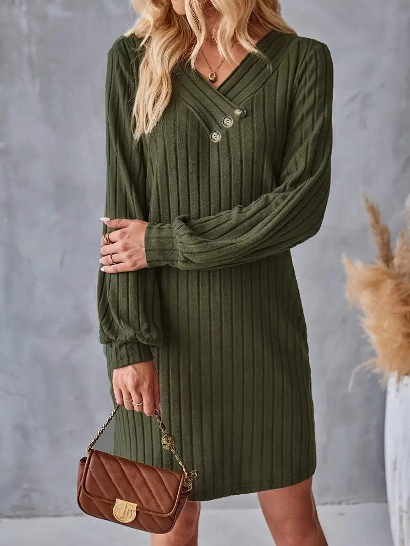 Elegante abito a coste con scollo a V - maniche lunghe con dettaglio di bottoni