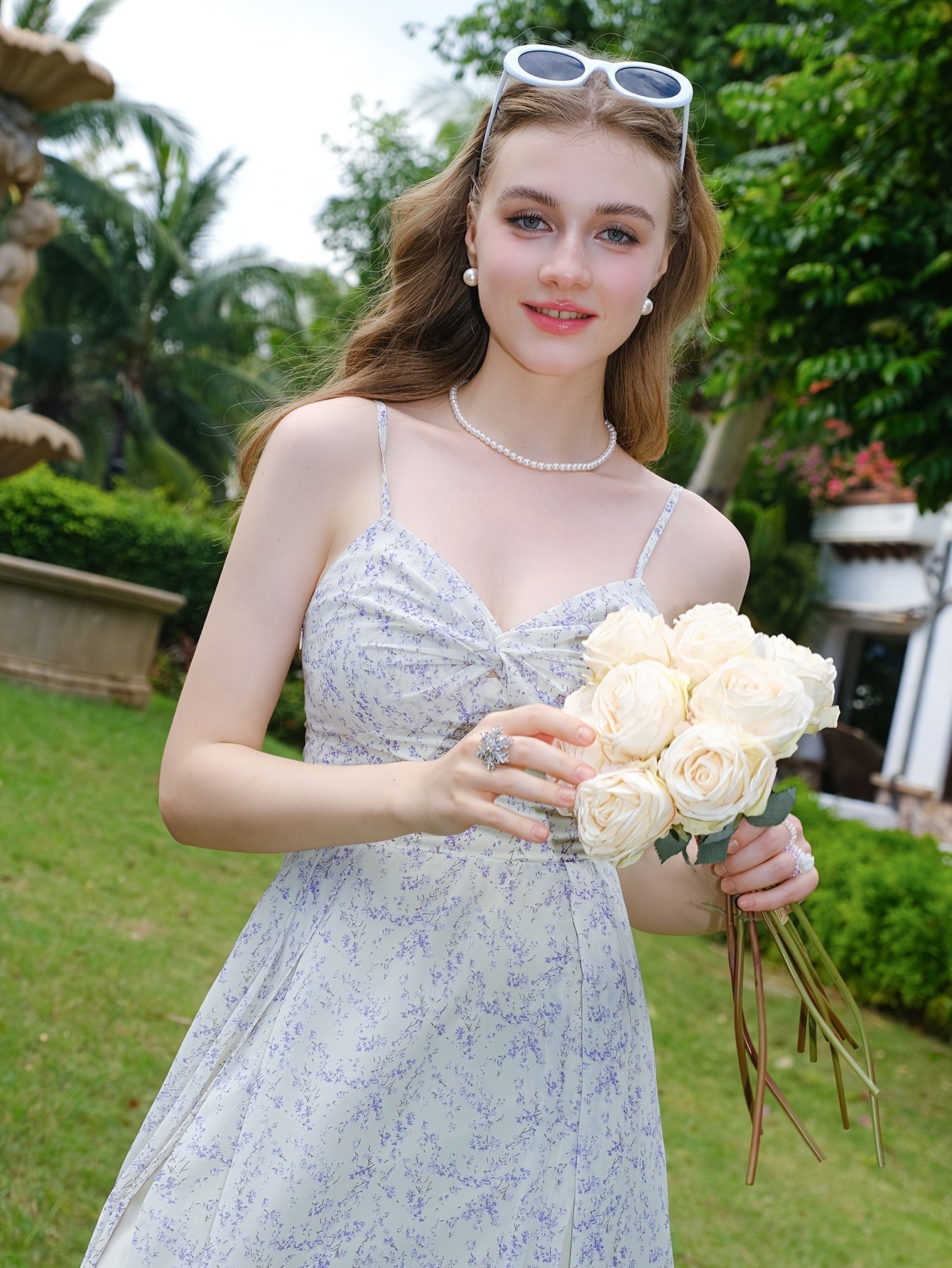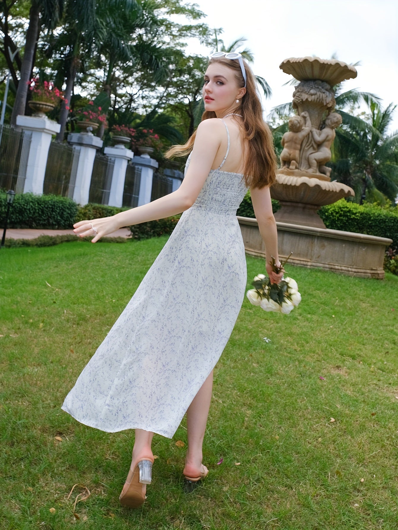 Elegante abito a spaghetti con stampa all-over - Spacco, design senza schienale