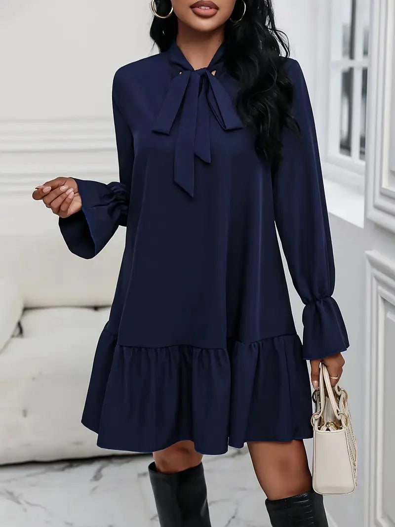Questo elegante abito con fiocco sulla scollatura unisce raffinatezza e stile per ogni occasione. Con la sua elegante scollatura a fiocco e il design lusinghiero in tinta unita, emana un'eleganza senza tempo. Le maniche lunghe e l'orlo increspato conferiscono all'abito un tocco femminile e grazioso e completano il look. È realizzato in materiale confortevole e traspirante e può essere indossato tutto il giorno. Abbinatelo a tacchi alti o a stivali per uno stile versatile. Un must del vostro guardaroba per il lavoro, le feste o le occasioni speciali.