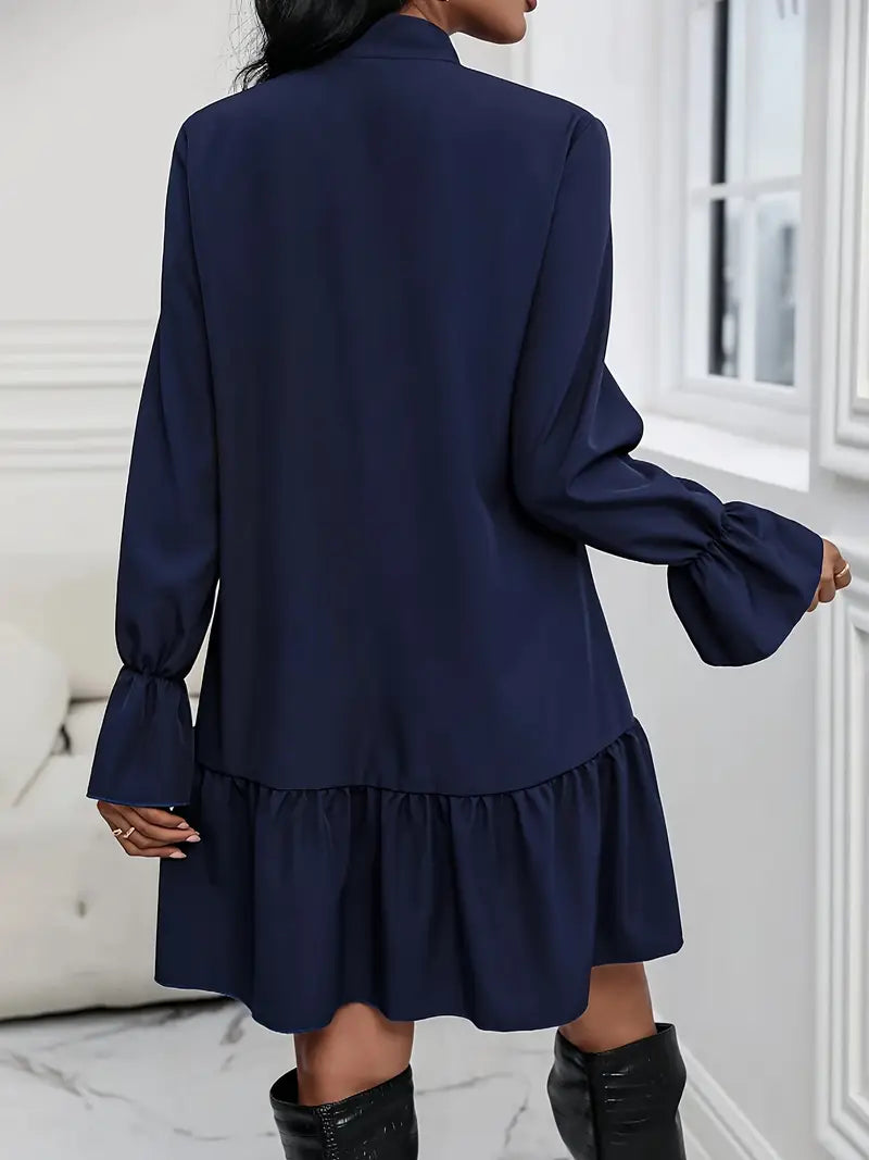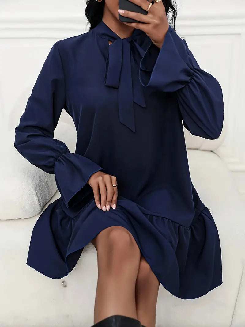 Sofisticato abito a maniche lunghe con scollatura a fiocco e finiture a balze